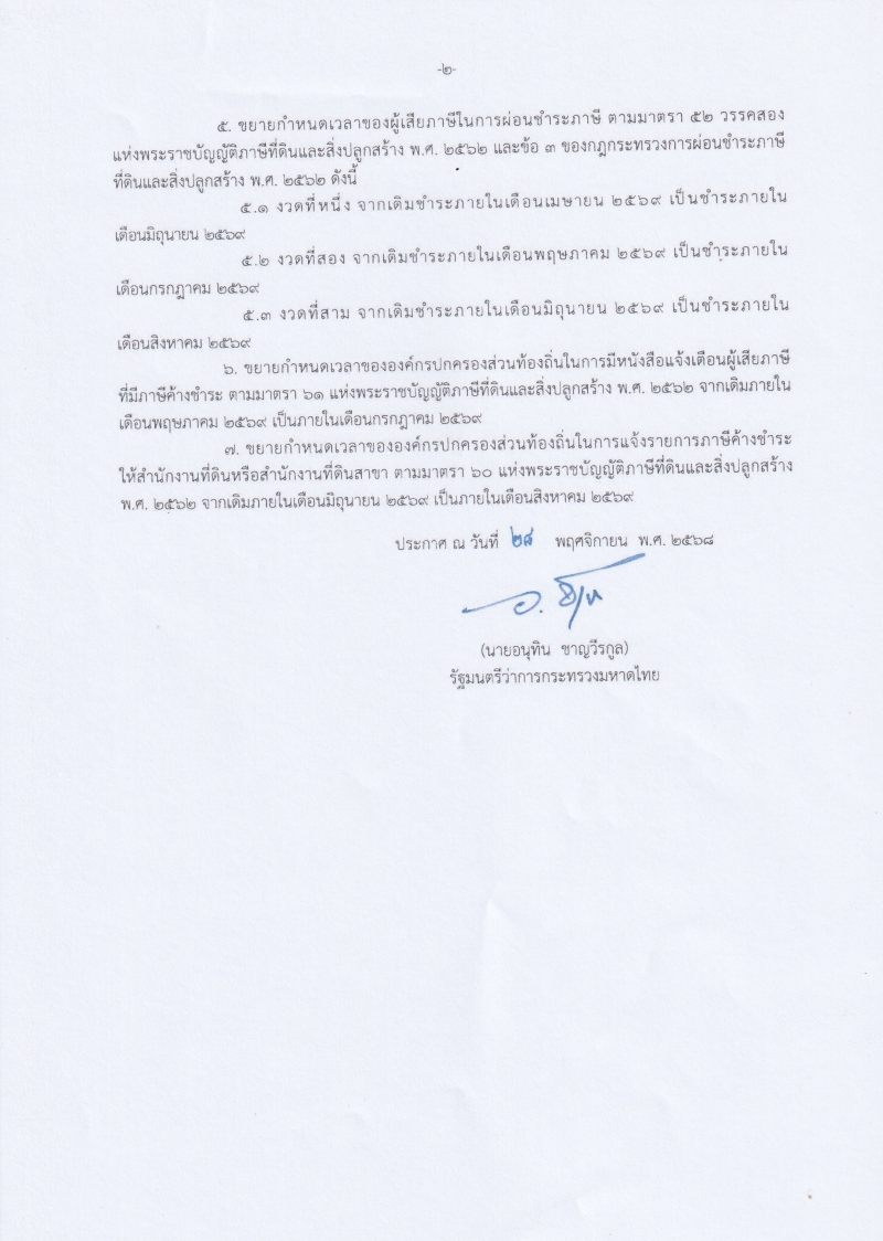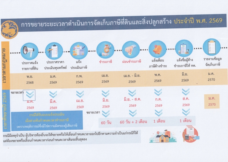 ประกาศกระทรวงมหาดไทย เรื่อง ขยายกำหนดเวลาดำเนินการตามพระราชบัญญัติภาษีที่ดินและสิ่งปลูกสร้าง พ.ศ.2562 ประจำปี พ.ศ.2569
